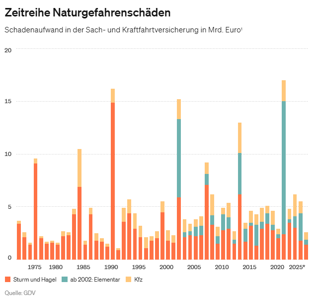 Auf die Sachversicherung entfallen 2025 rund 1,4 Milliarden Euro Schäden durch Sturm, Hagel und Blitz. Hinzu kommen 500 Millionen Euro Schäden durch weitere Naturgefahren wie Überschwemmung und Starkregen. In der Kraftfahrtversicherung belaufen sich die Schäden durch Stürme und Überschwemmungen auf 700 Millionen Euro. Erfasst wurden in der Statistik Schäden an Häusern, Hausrat, Gewerbe- und Industriebetrieben sowie Kraftfahrzeugen.