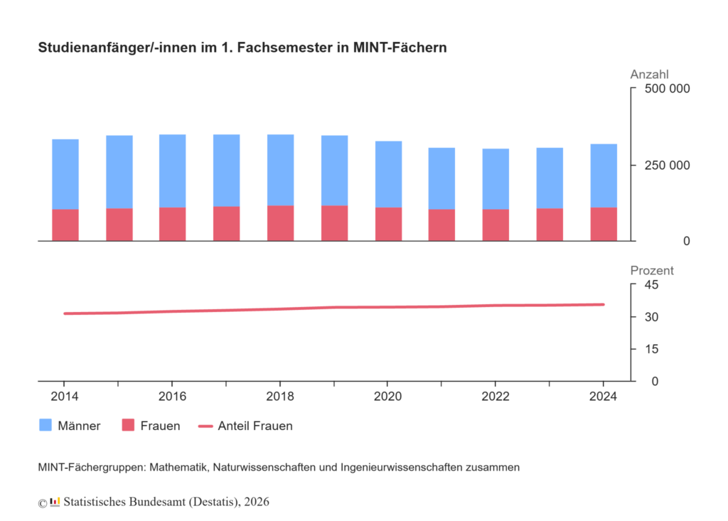 Wiesbaden (28.1.26) – Frauen entscheiden sich nach wie vor seltener für ein Studium im Bereich Mathematik, Informatik, Naturwissenschaft und Technik als Männer. Der Frauenanteil unter den Studienanfängerinnen und -anfängern im 1. Fachsemester in solchen MINT-Fächern ist in den vergangenen Jahren jedoch kontinuierlich gestiegen. Wie das Statistische Bundesamt (Destatis) mitteilt, waren im Studienjahr 2024 mehr als ein Drittel (36 %) der Studienanfängerinnen und -anfänger im 1. Fachsemester im MINT-Bereich Frauen – ein neuer Höchststand. Zehn Jahre zuvor hatte der Frauenanteil in diesem Bereich noch bei 31 % gelegen.