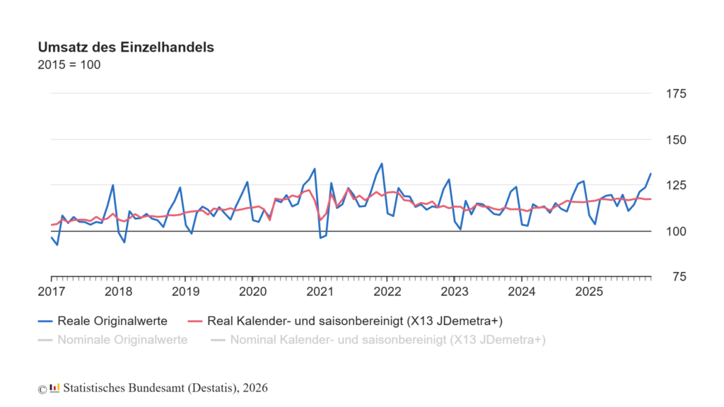 Im Weihnachtsgeschäft des Dezembers 2025 setzten die Einzelhandelsunternehmen nach vorläufigen Ergebnissen real 3,2 % und nominal 3,5 % mehr um als im Dezember 2024. Kalender- und saisonbereinigt betrug der Zuwachs real 1,5 % und nominal 1,7 %. Im Vergleich zum Dezember 2021, indem der bisher höchste Umsatz in einem Dezember seit Beginn der Zeitreihe im Jahr 1994 erzielt wurde, war der reale (nicht-kalender- und saisonbereinigte) Umsatz im Dezember 2025 um 4,0 % niedriger. Im Dezember 2024 war real 7,0 % weniger Umsatz generiert worden als im Dezember 2021.