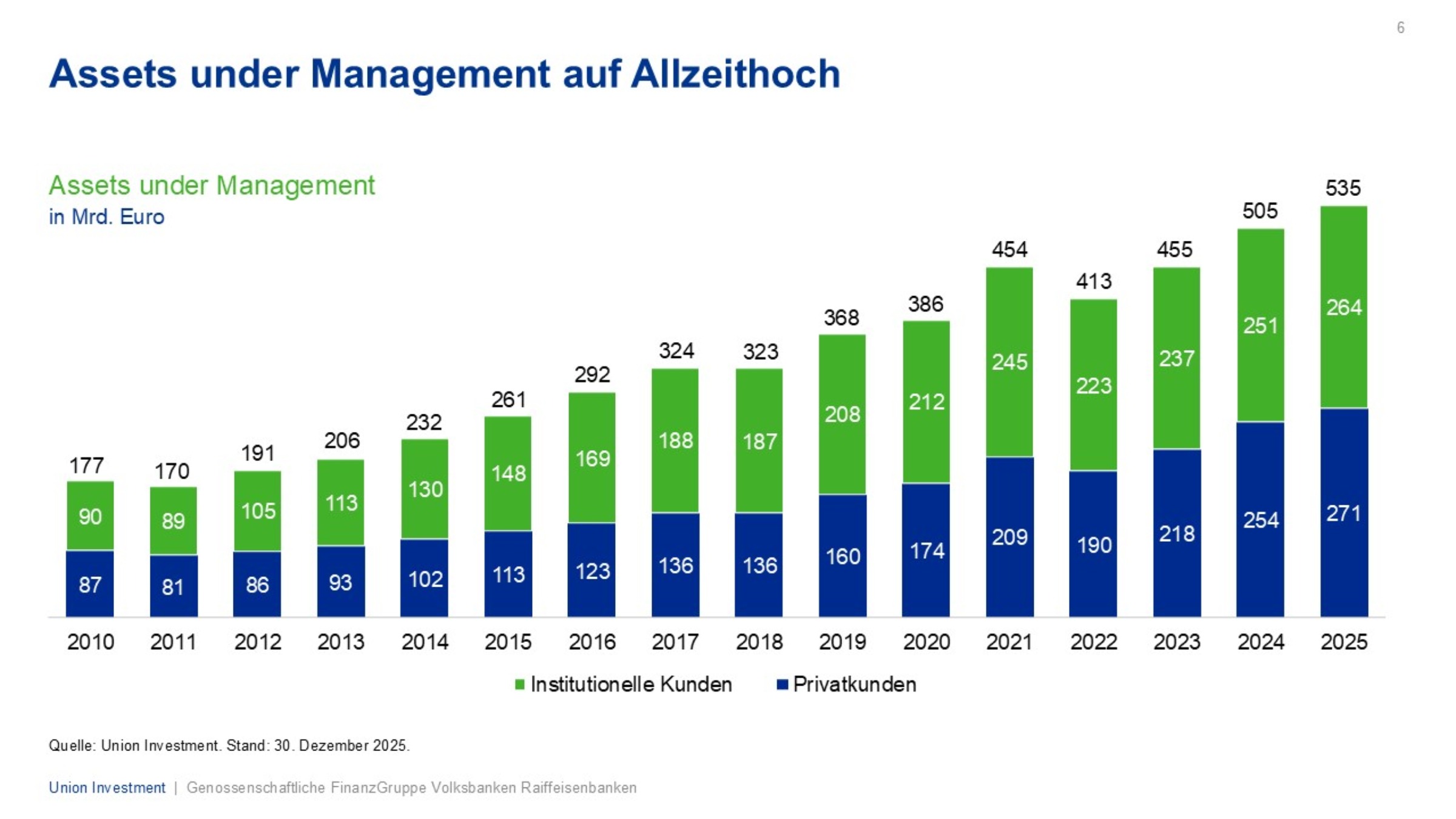 Frankfurt/Main (24.2.26) – Union Investment hat das Geschäftsjahr 2025 in einem weiterhin herausfordernden geopolitischen und wirtschaftlichen Umfeld erfolgreich abgeschlossen. Der Nettoabsatz belief sich auf 23,3 Milliarden Euro und lag damit deutlich über dem Vorjahreswert (2024: 17,3 Mrd. Euro). Getragen von einem starken Neugeschäft und einer insgesamt positiven Marktentwicklung, stiegen die Assets under Management bis zum Jahresende auf einen neuen Höchststand von 534,6 Milliarden Euro (2024: 504,7 Mrd. Euro). „Union Investment zählte auch 2025 zu den absatzstärksten Fondsgesellschaften in Deutschland und Europa. Wir wachsen kontinuierlich – und das in einem Umfeld, das von hoher Unsicherheit geprägt ist“, sagte Vorstandsvorsitzender Hans Joachim Reinke anlässlich der Jahrespressekonferenz des Unternehmens.
